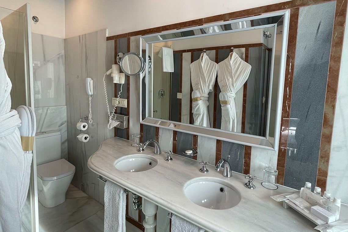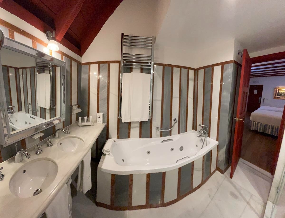 Junior Suite de 32 m2 con dos zonas independientes: Salón y dormitorio. Tiene 2 Cuartos de Baño completos con Hidromasaje y ducha independiente. Vistas sobre los Baños Califales.