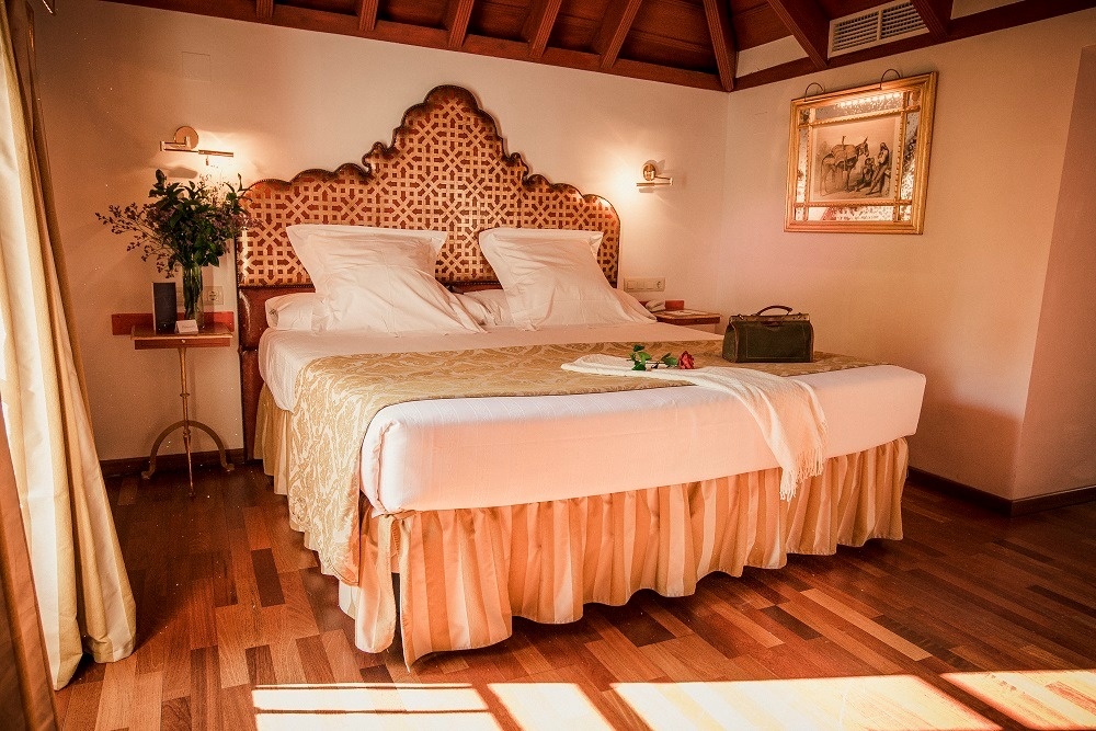 Habitación amplia, confortable y decorada cuidadosamente con cabeceros artesanales de cordobán y equipada con bañera hidromasaje.